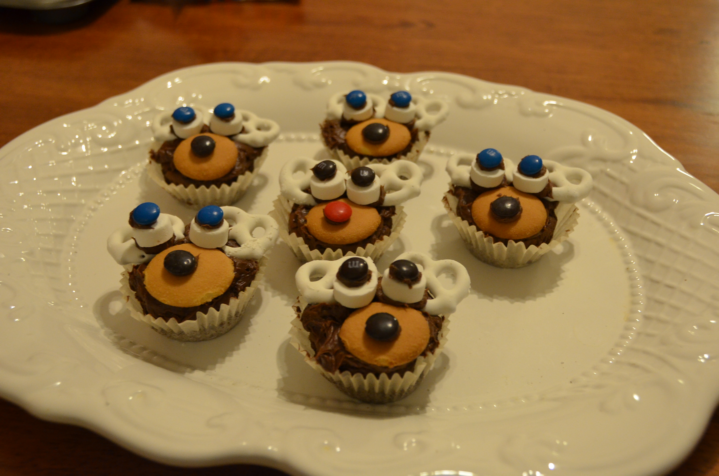 4) Dip two mints or mini marshmallows in frosting and place in centre of each cupcake, above the wafers and on top of the pretzels. The frosting holds the reindeer’s eyes in place.